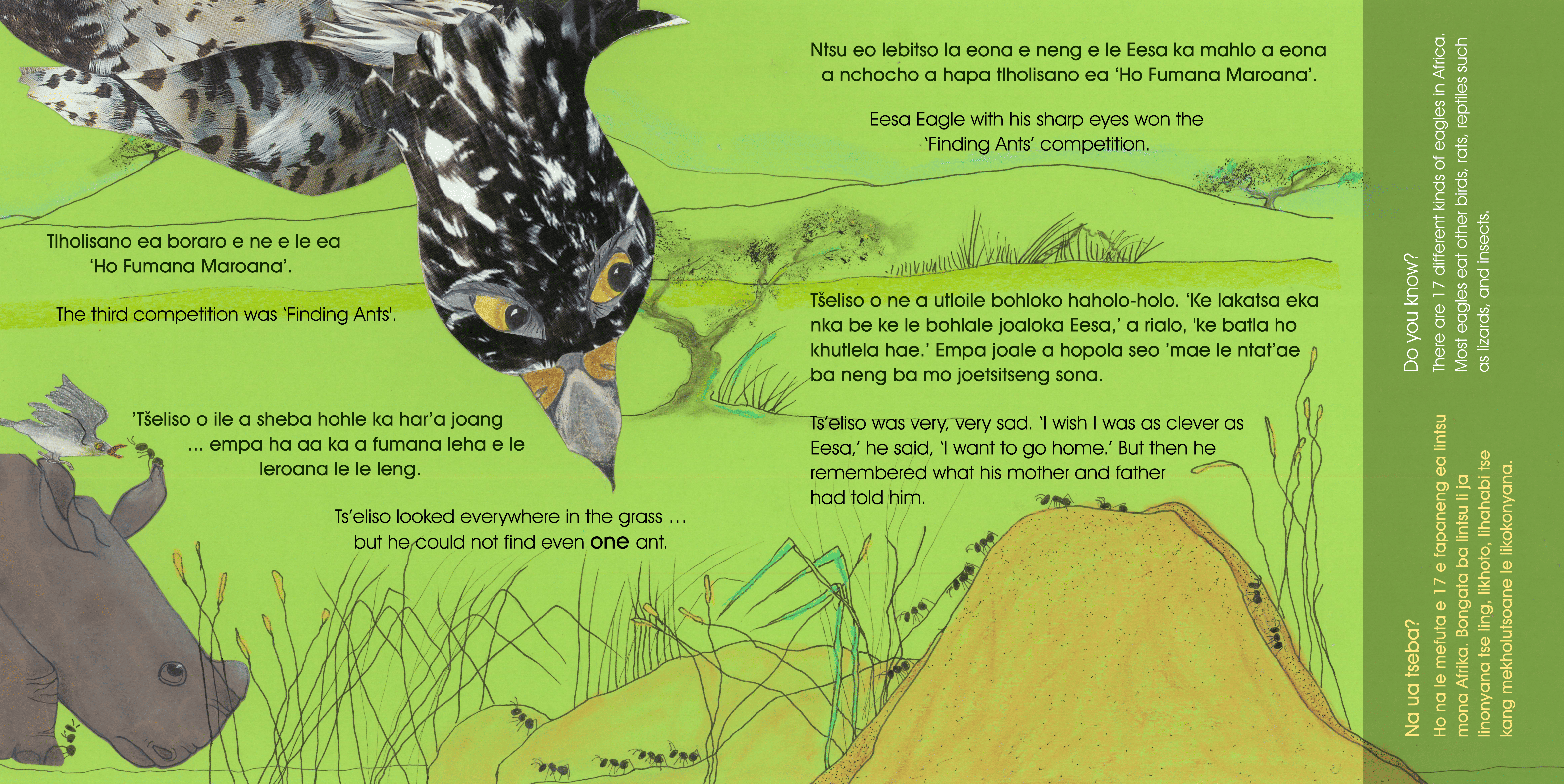 In I am happy to be me! (Ke thabetse ho ba ‘na!), Tšeliso ts’ukulu, a baby rhinoceros, is not happy about sports day. He thinks that he is not good at any kind of sport, and that he will not win any of the events. “Just be yourself and do your best and you will see,” say his mother and father, and that is exactly what happens. Tšeliso wins the most difficult event of all, and proves to himself that he is just as good as any other baby animal. Which of course he is!